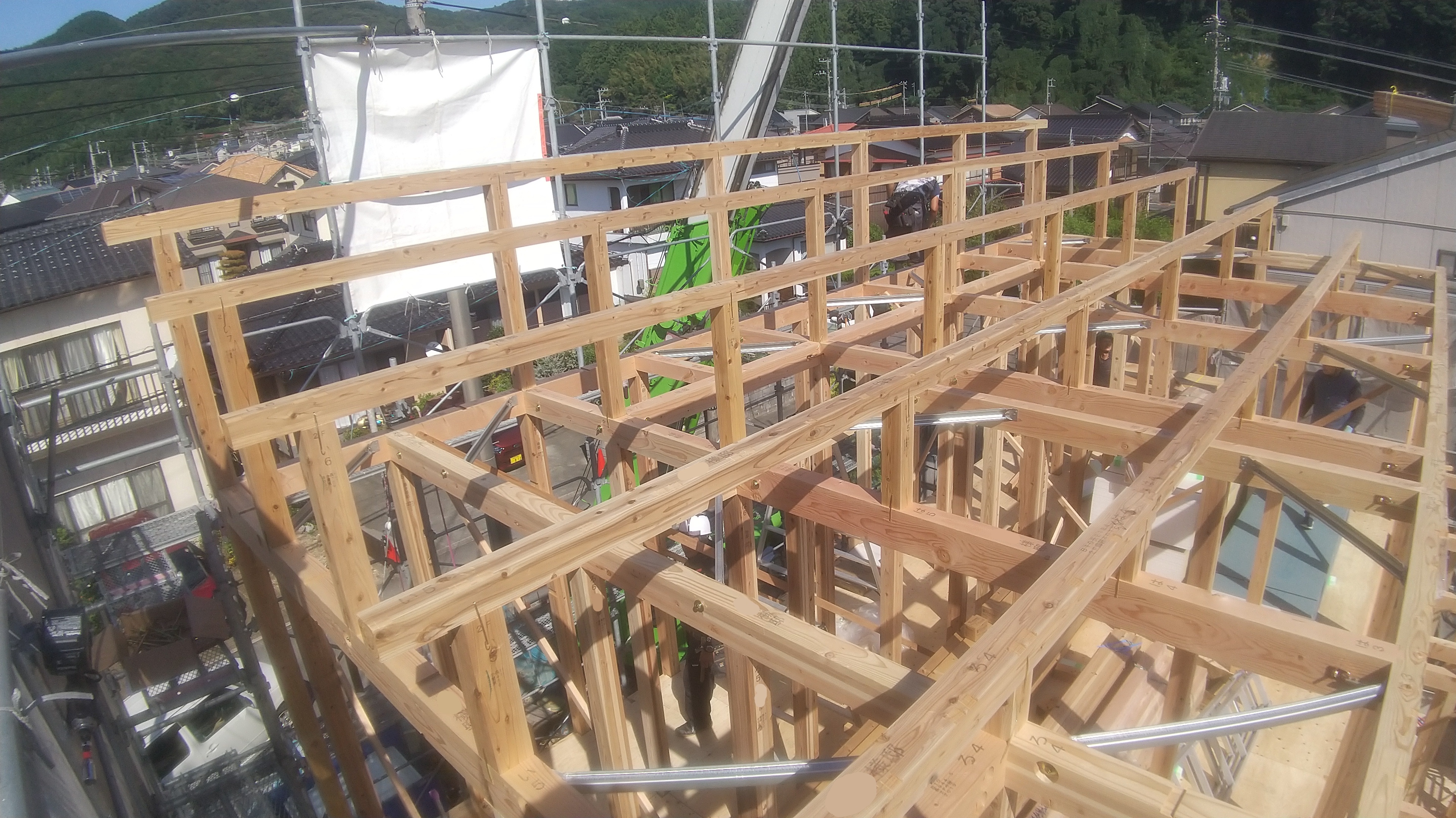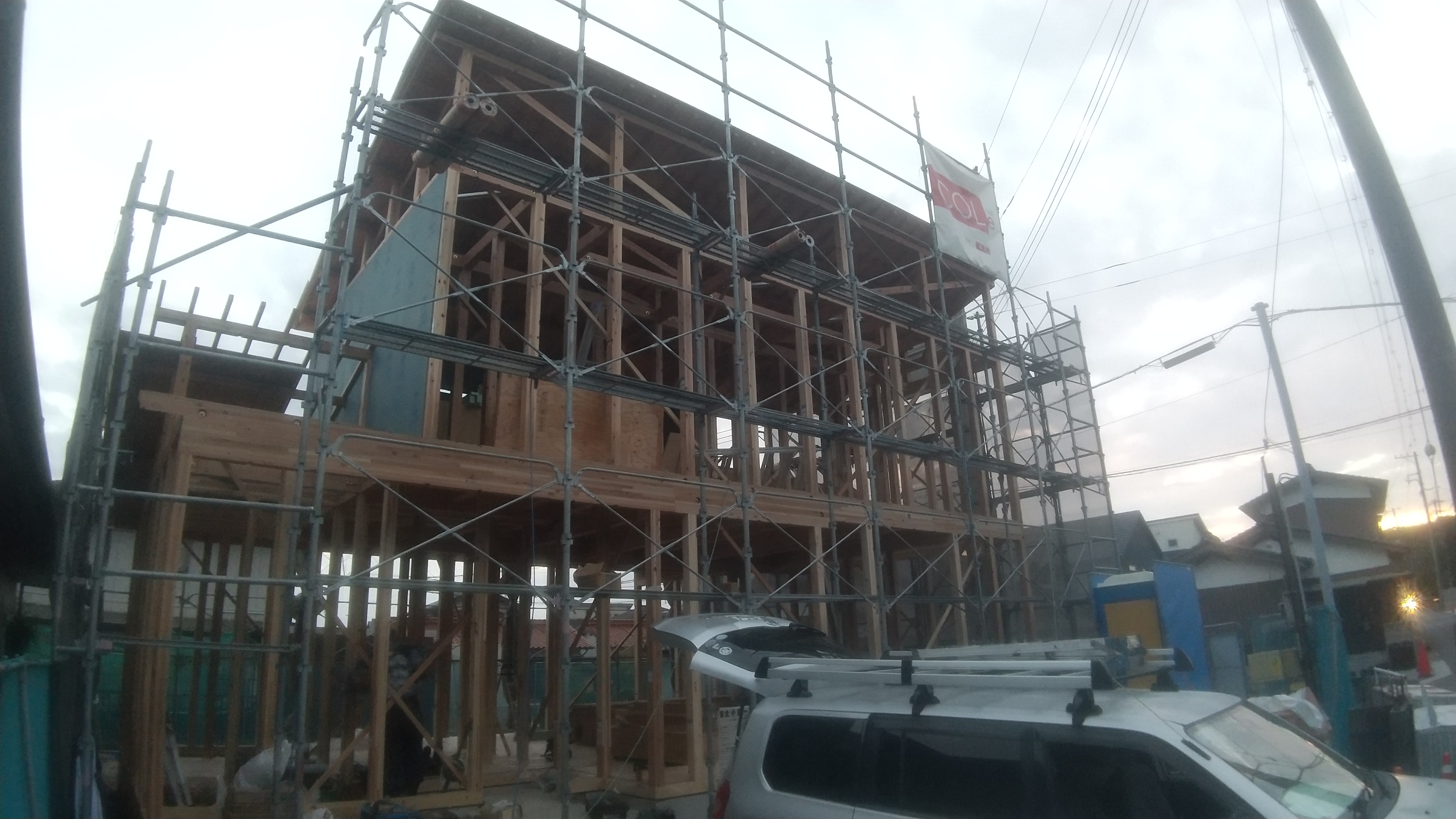 夕方の写真です。 二階の屋根は野地合板まで貼り 一階の屋根の組立中です。 夕暮れの為、この日の作業はここまで 翌日 続きの作業の屋根仕舞いをして行き 間柱や面材を貼り付けていきます。