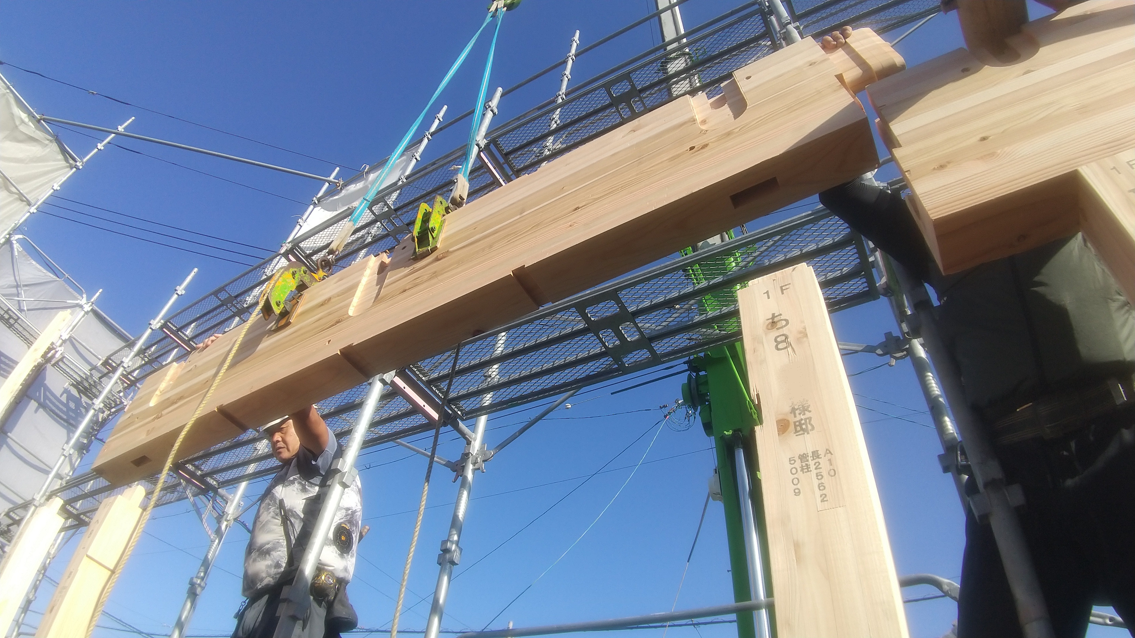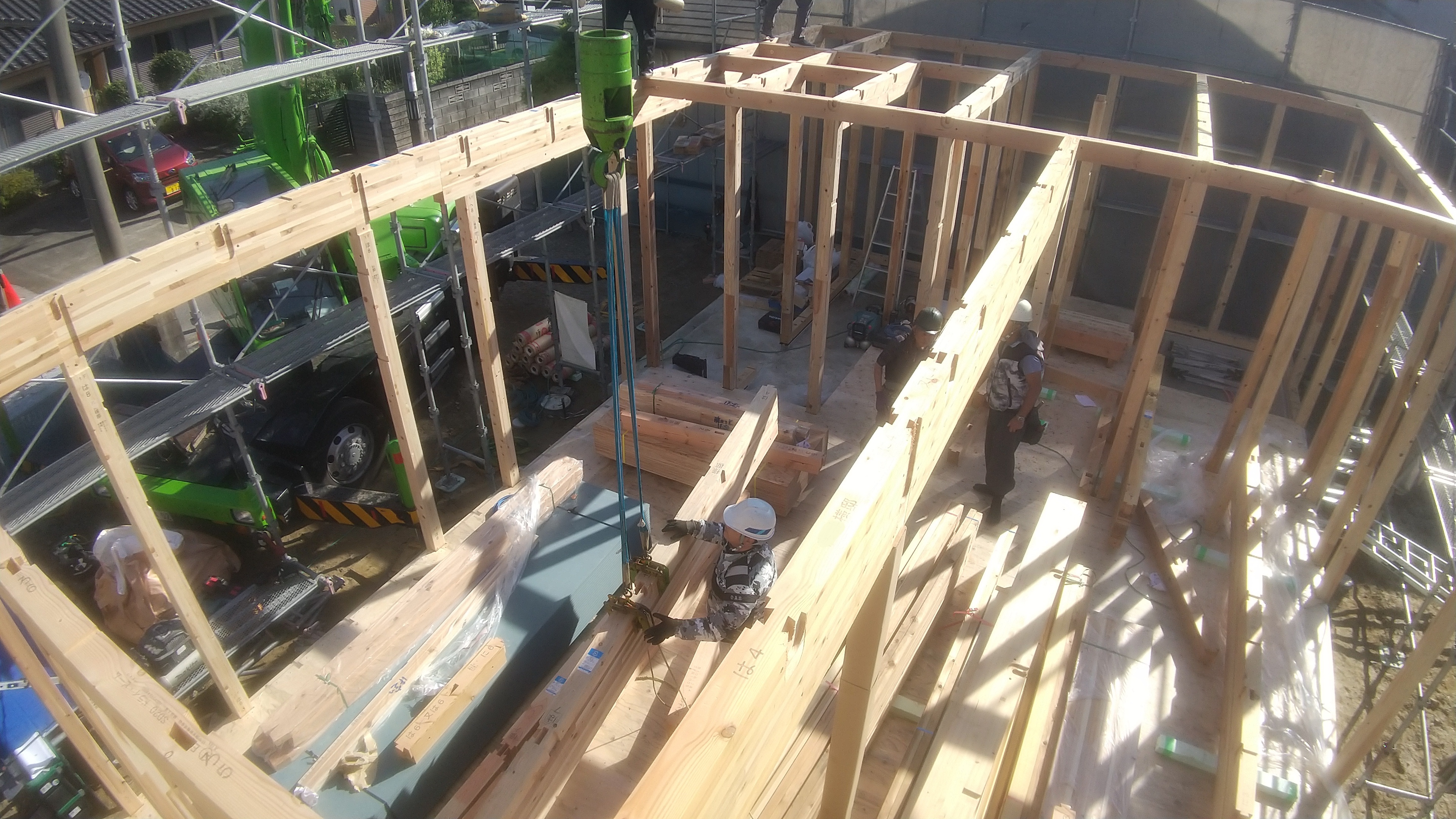 1階小屋組み工事が着々と進んでいます。 組み立てる順番は外回りを繋げて 中の主になる所を通し(写真) 細かく繋いで行きます。