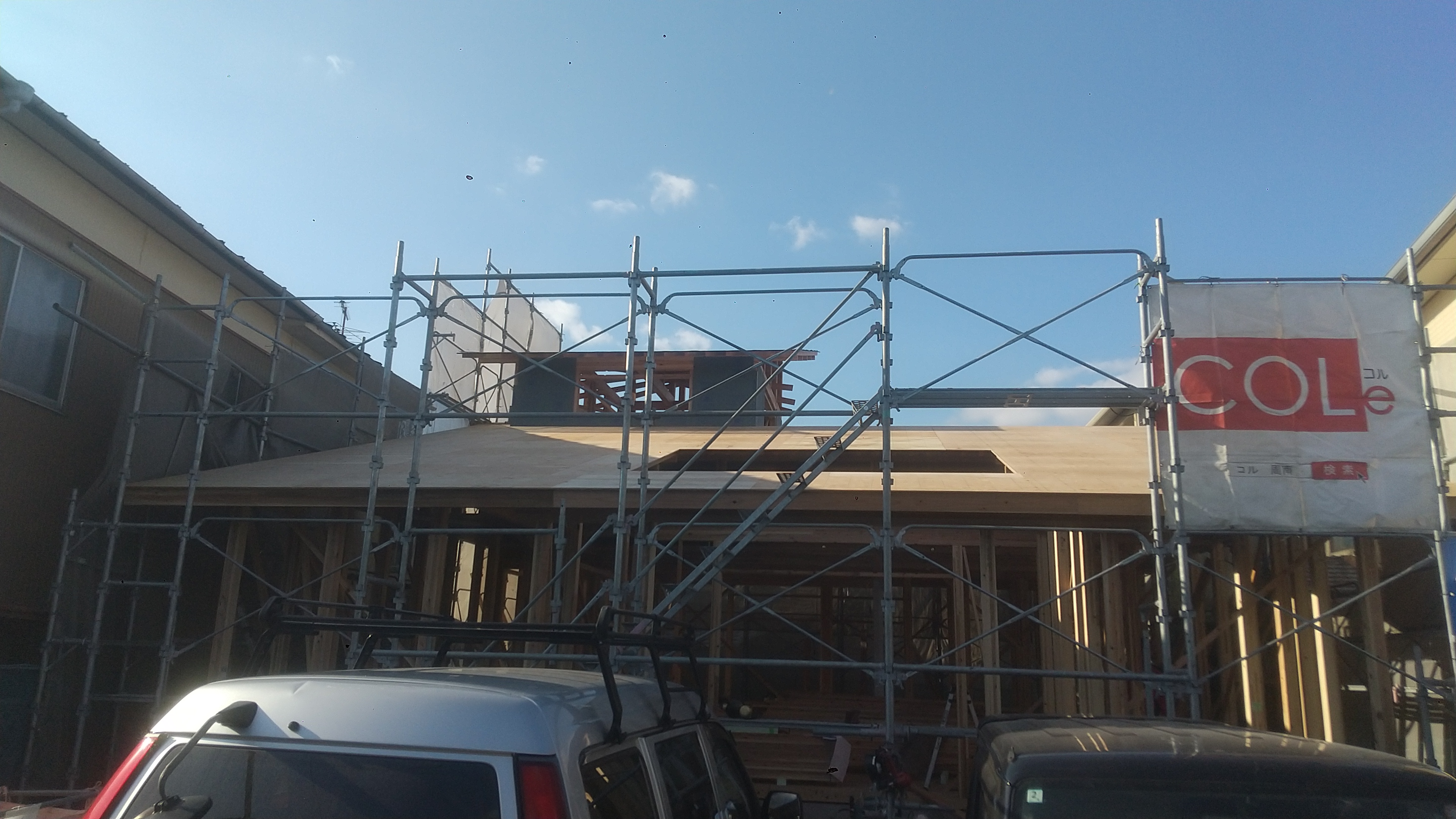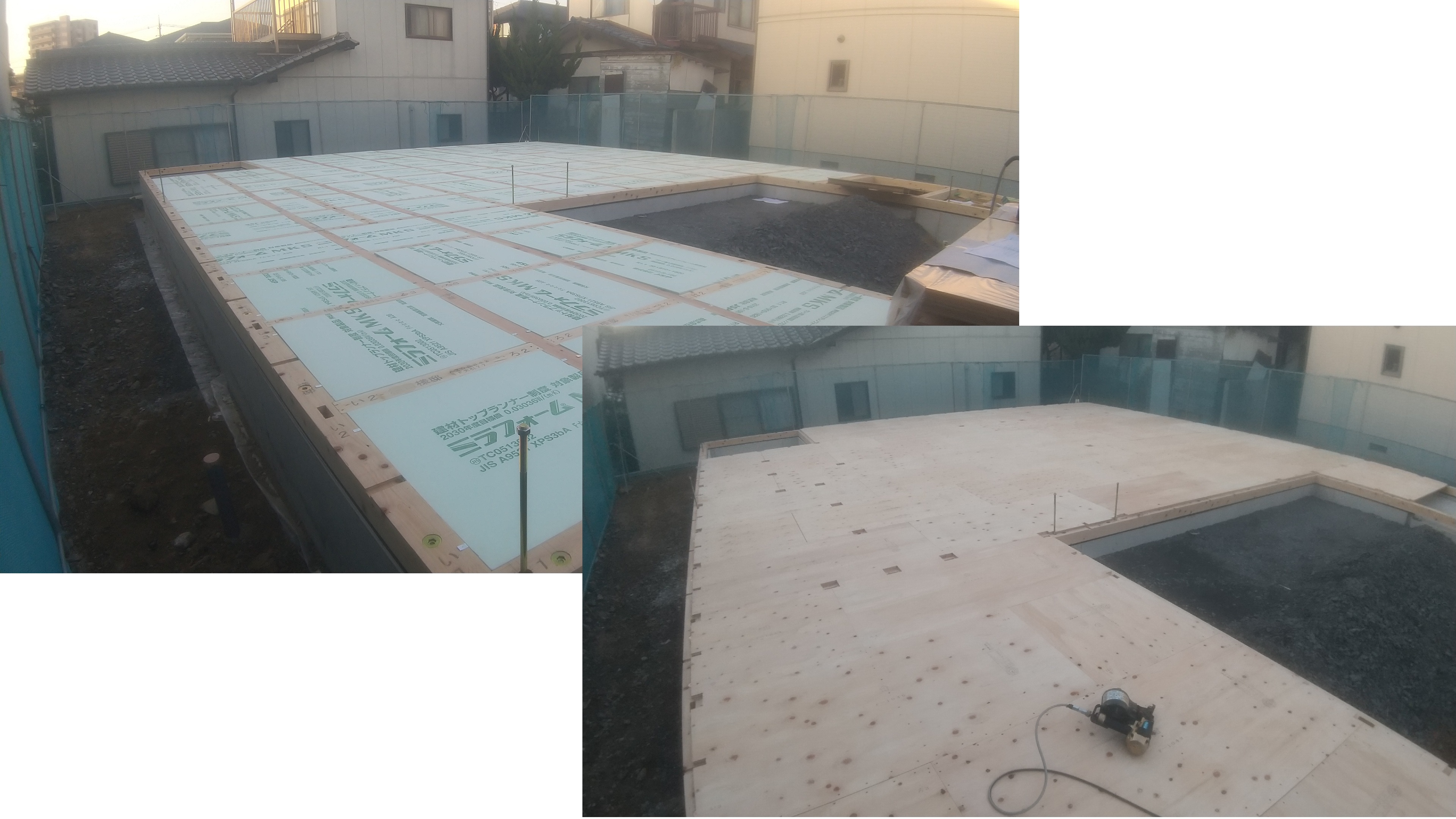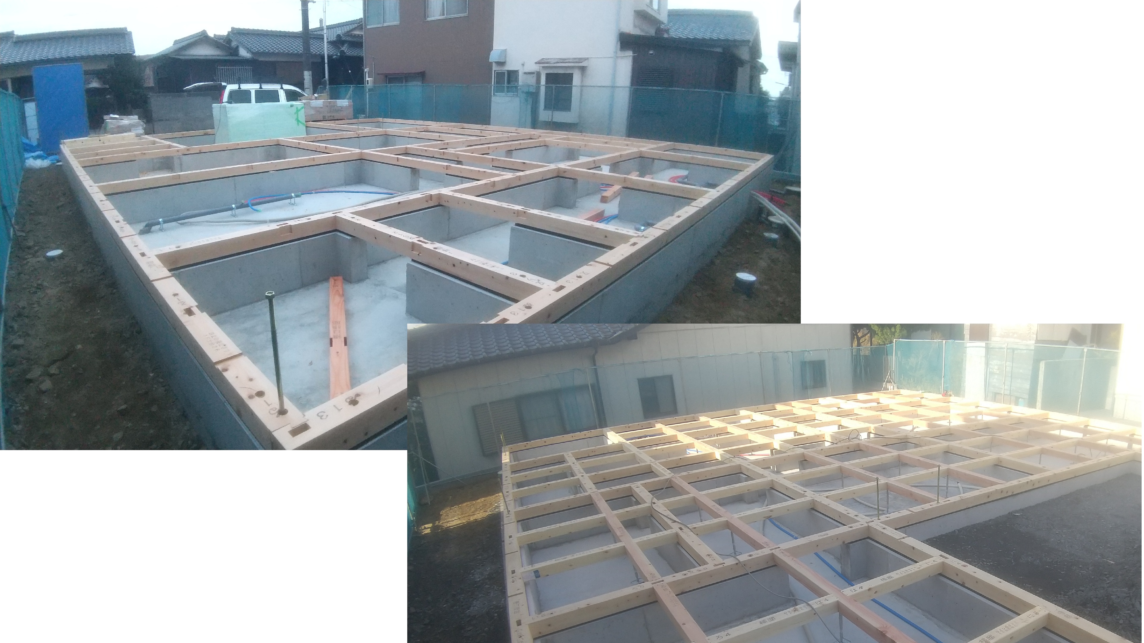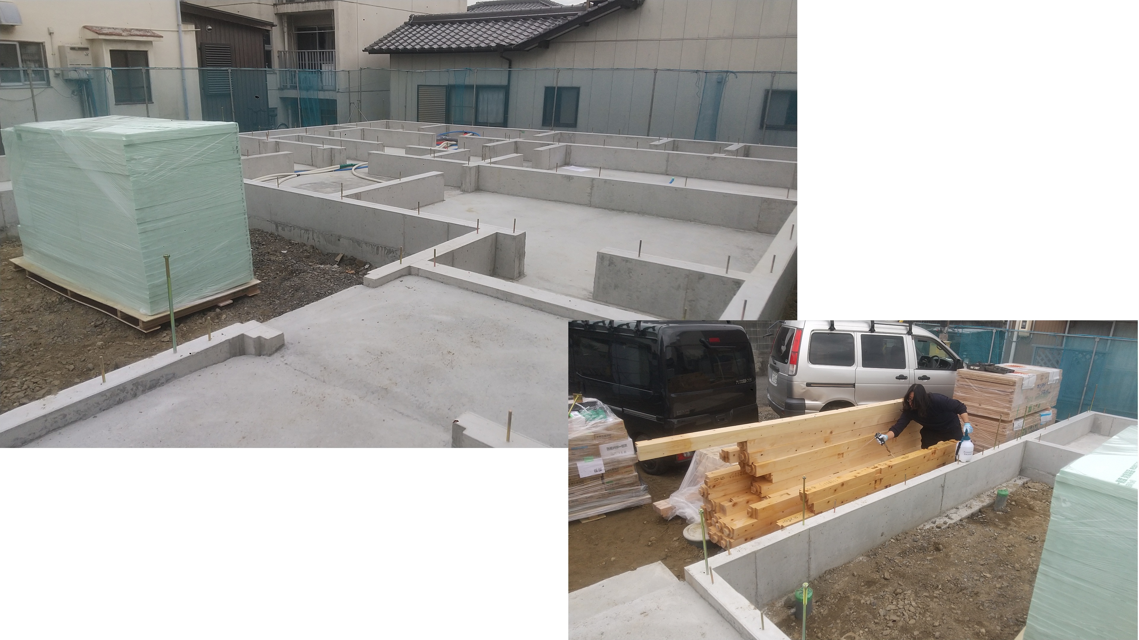 木材下の黒い物は通気の為の基礎パッキン材です。