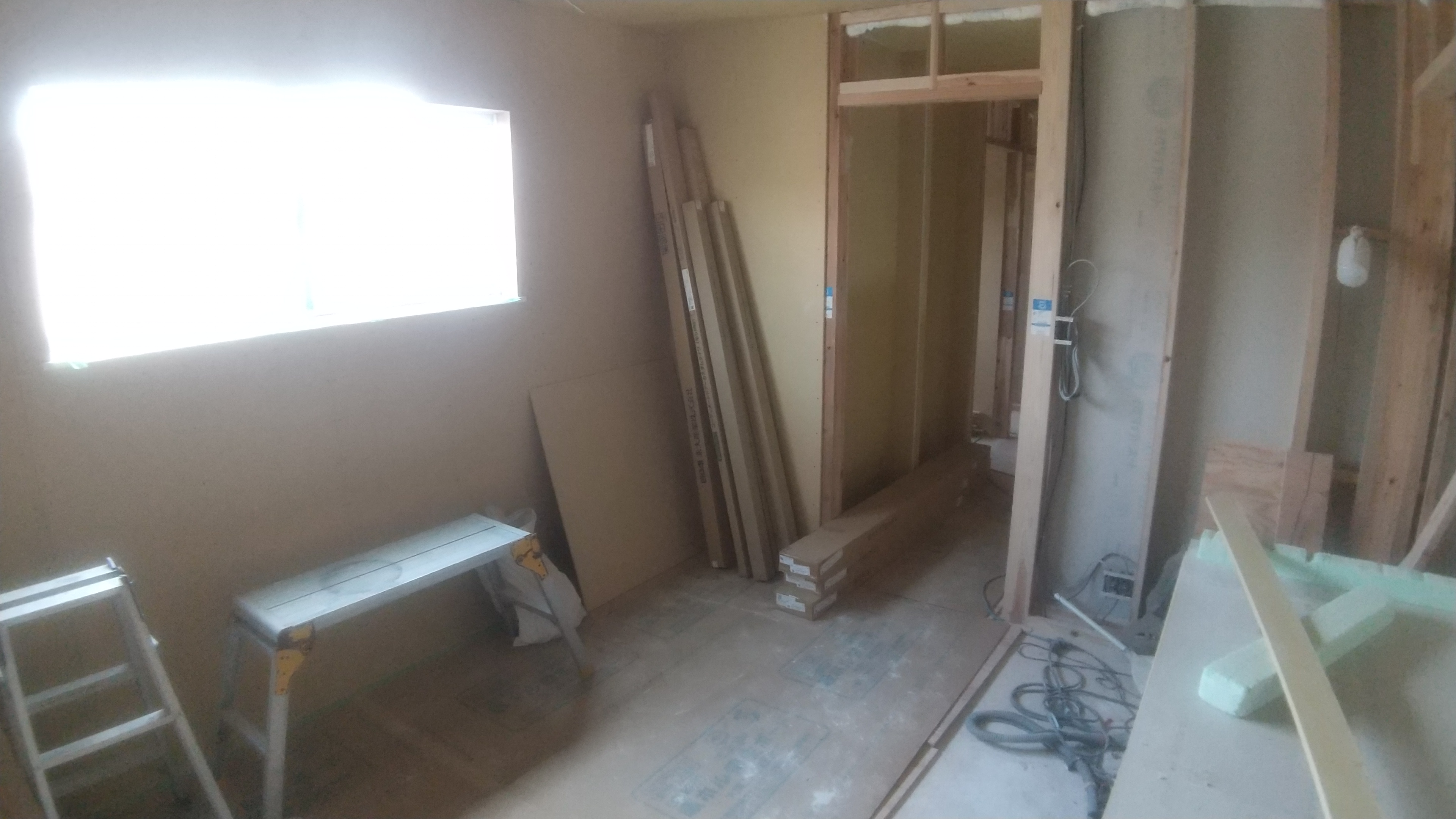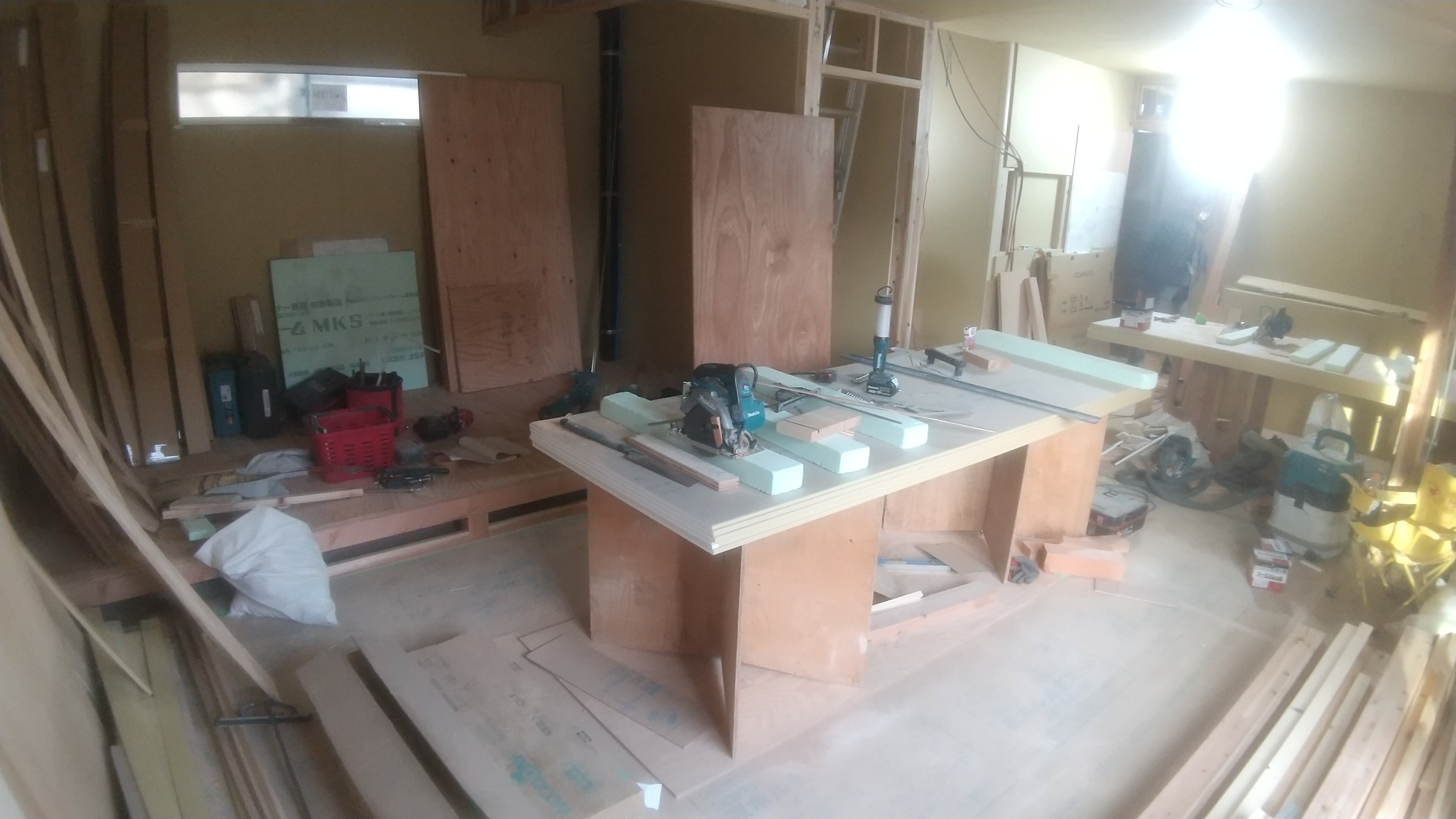 2Fは、ほぼ壁の石膏ボードが貼り終わり 工事個所を詰めて追って行っています。 もう少しすると棚板や幅木等の仕上げ材の取付になります。