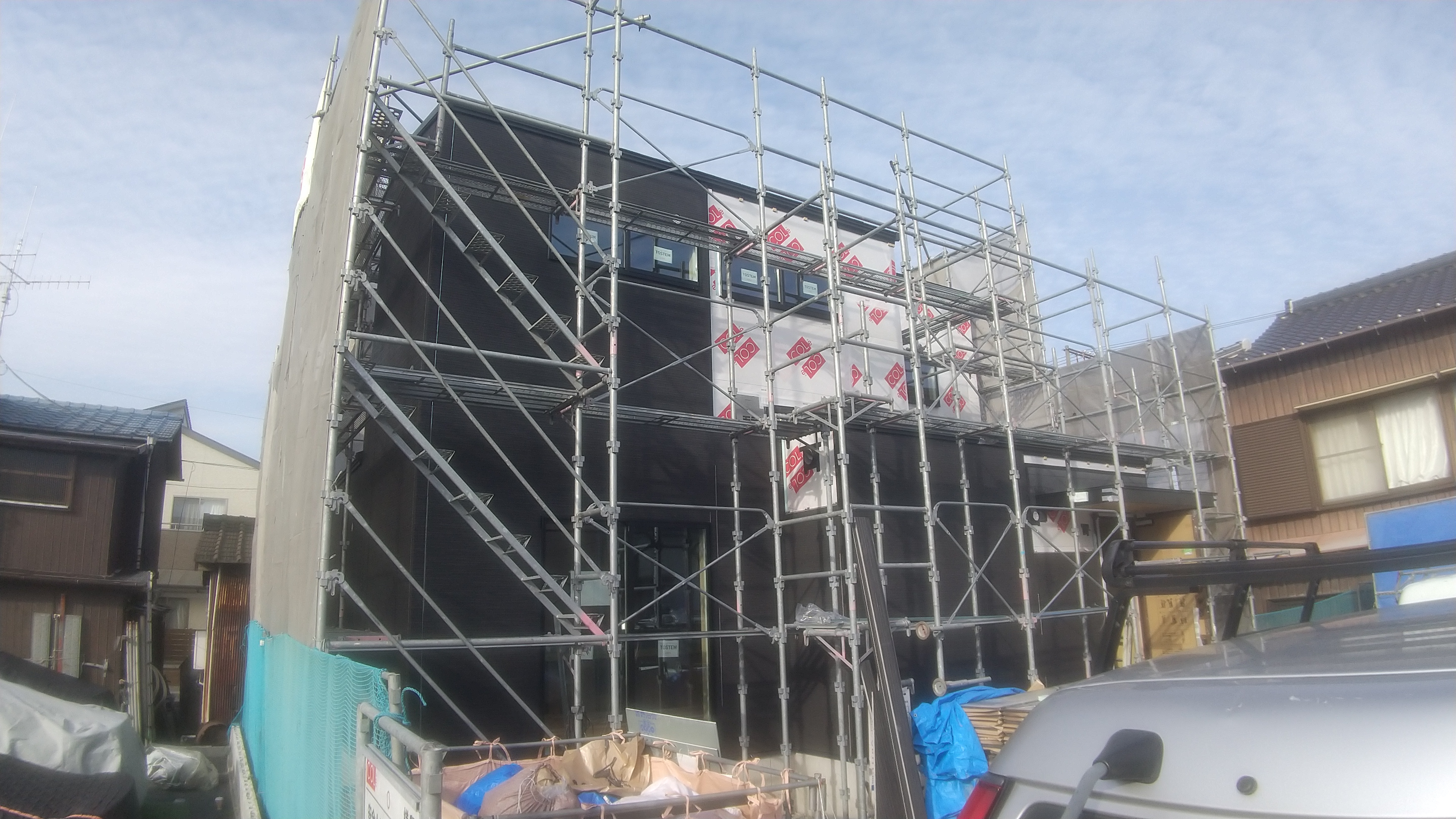 ここ3日は暖かい日が続いていて 作業しやすいです。 O様邸はサイディング工事が半分終わりました。 写真に写っていない裏面の外壁貼り作業中です。
