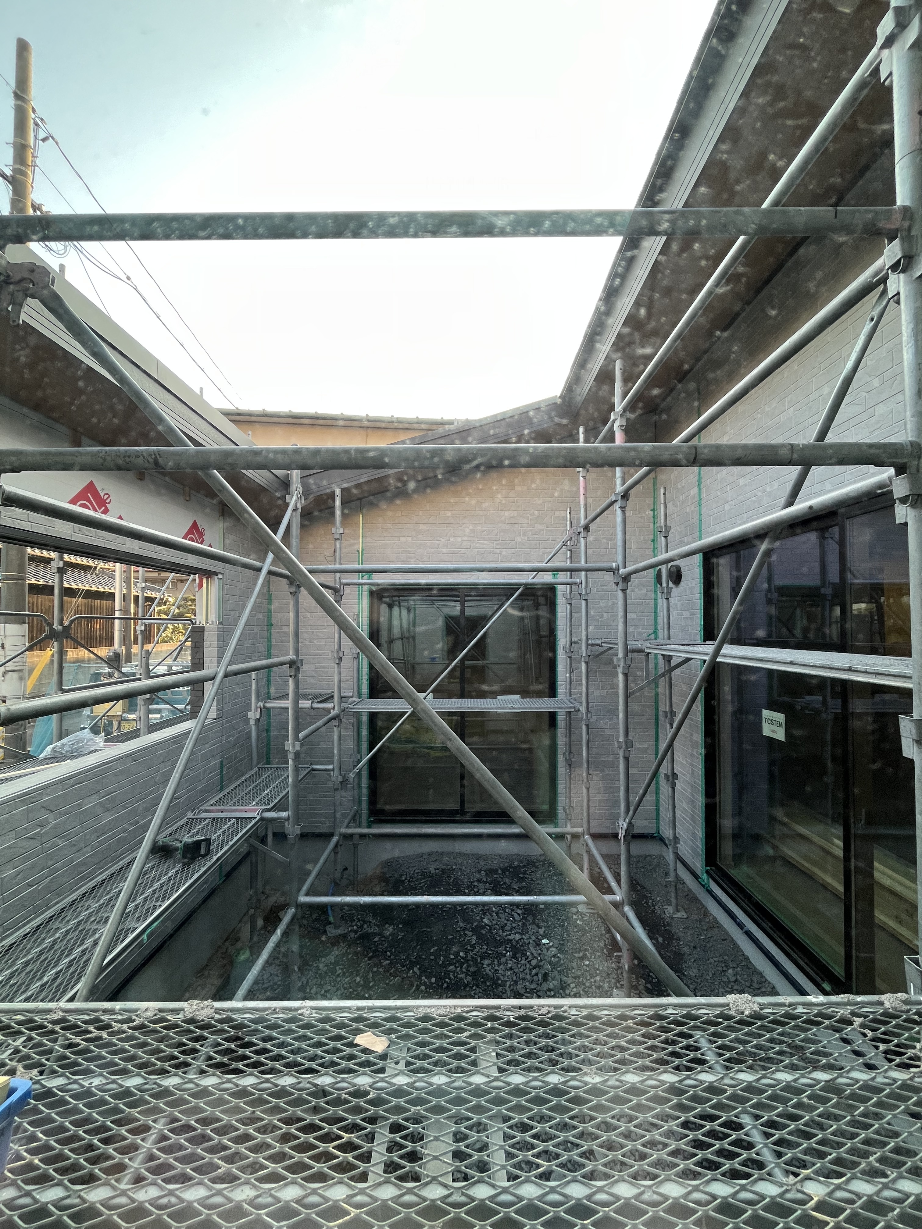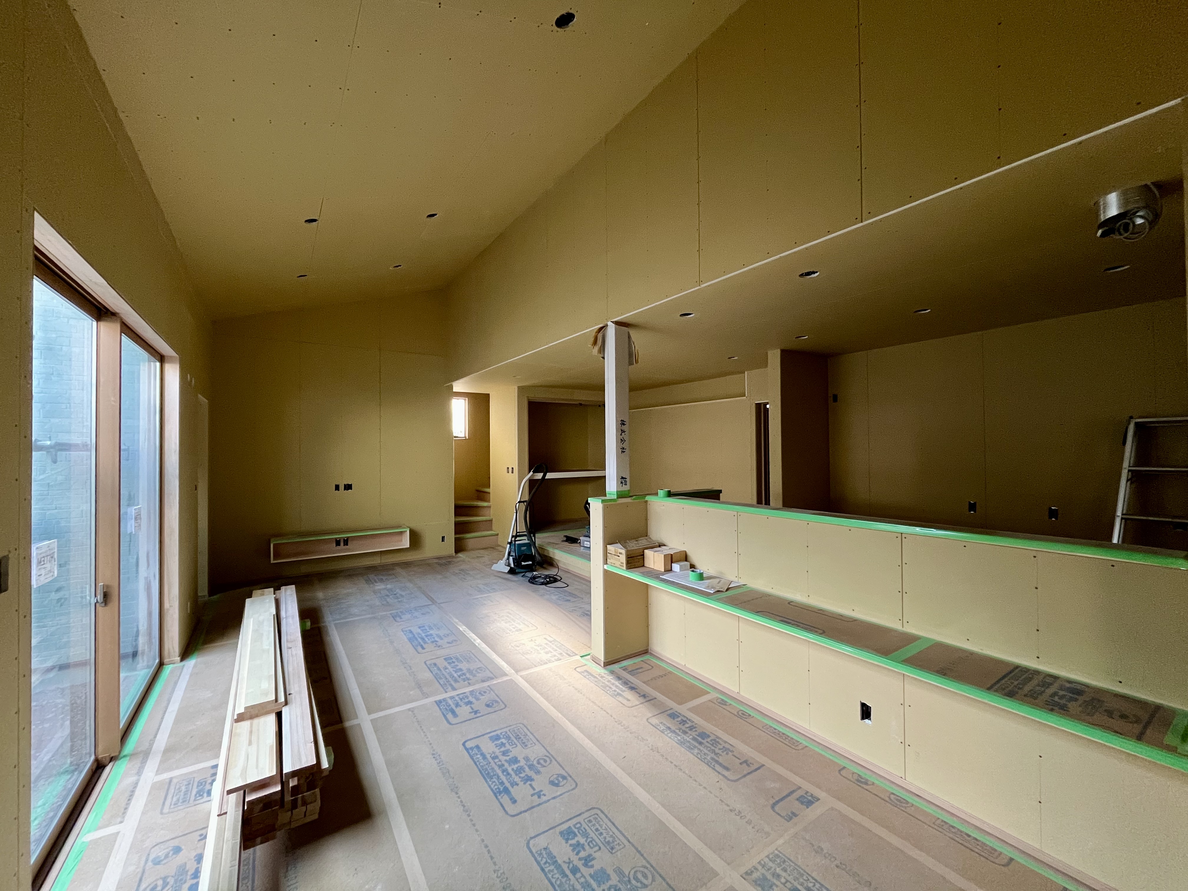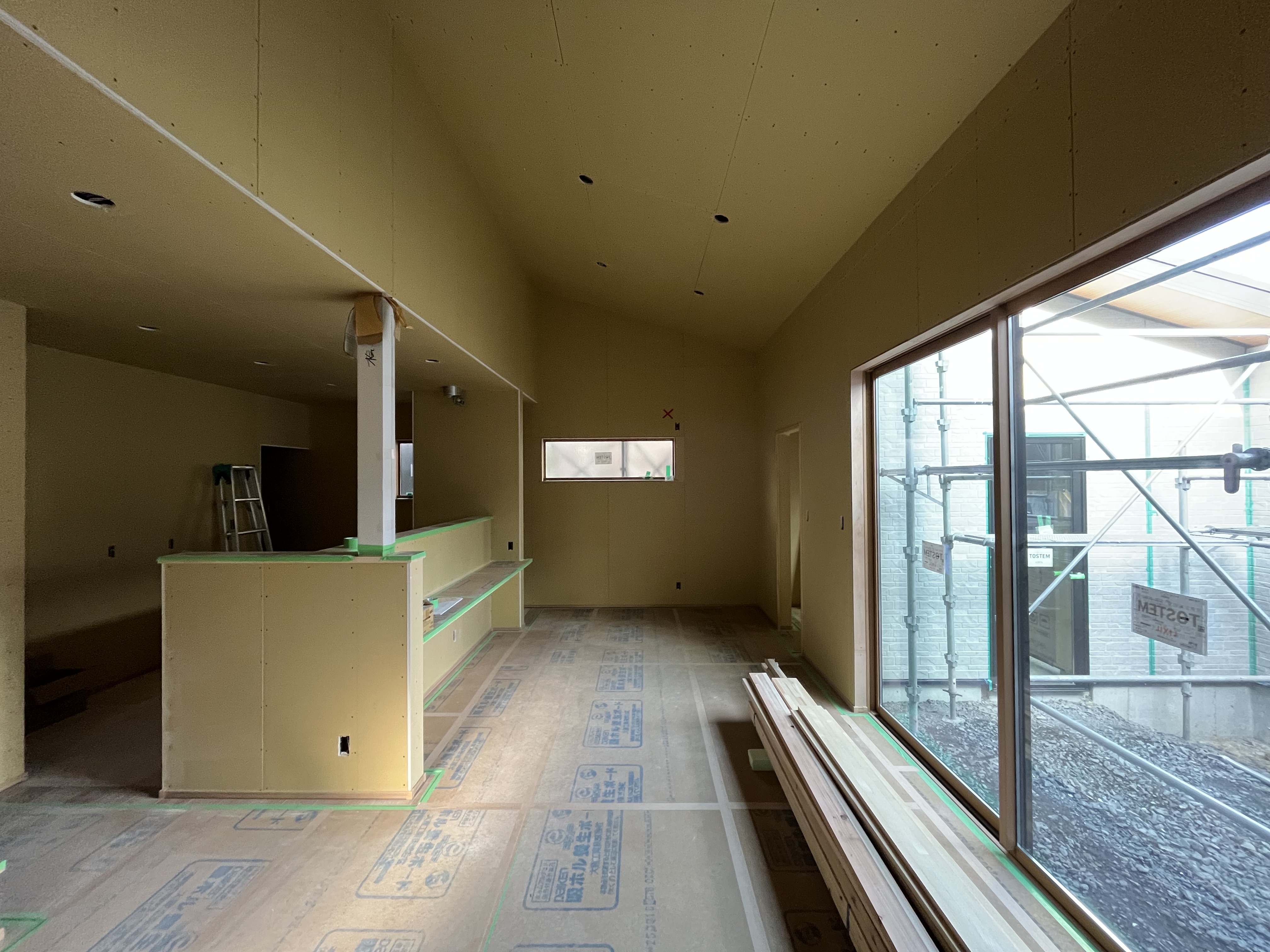 現在建築中のH様邸は大工工事が完了しました。 これから壁紙などの内装工事に入っていきます。 勾配天井の開放感あるリビングダイニングから広い中庭を眺めることが出来るとても素敵なお家です。 これから壁紙が貼られると明るくなり、雰囲気も一変します。 完成が楽しみです。