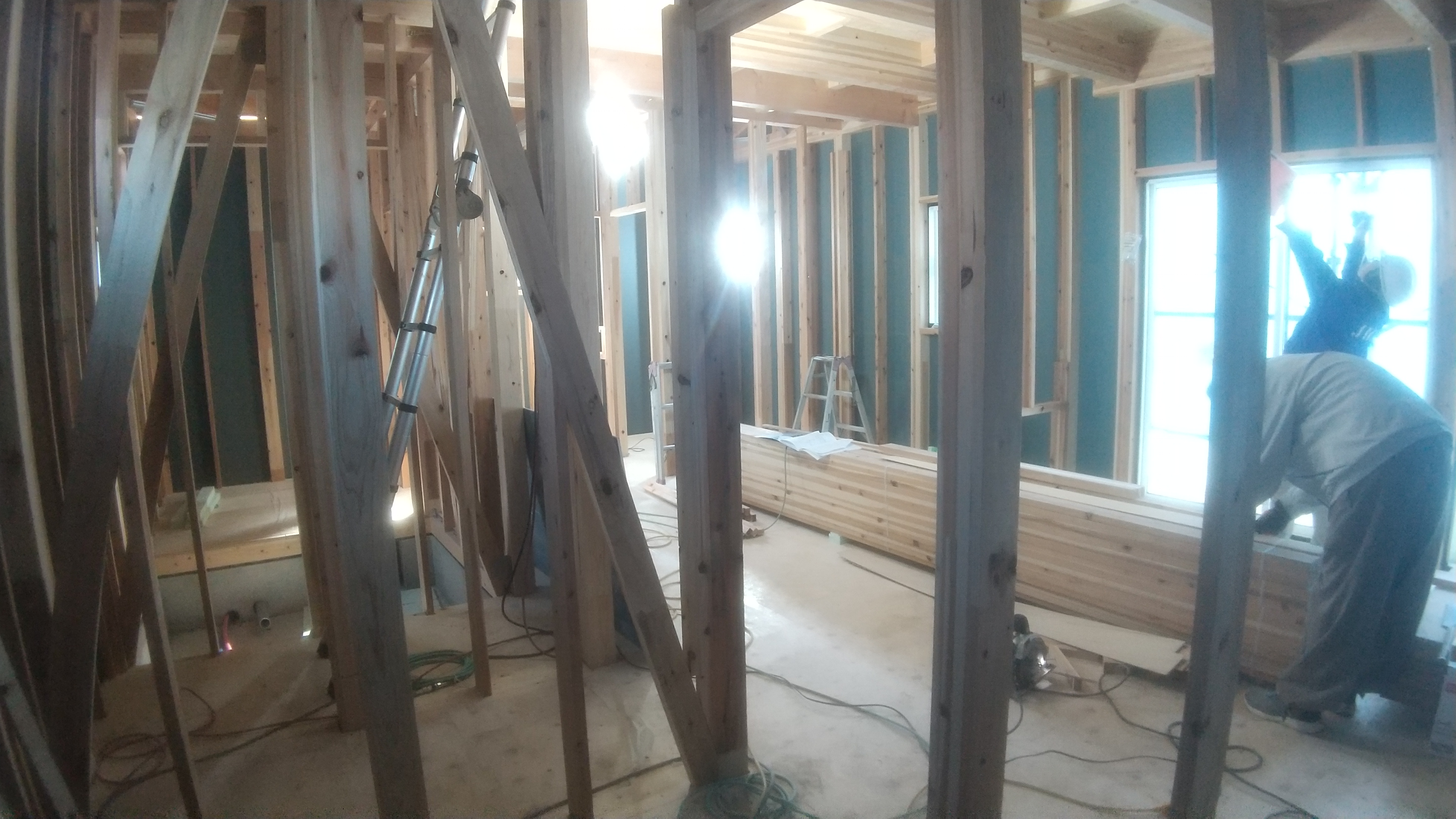 室内は 柱、桁、梁が図面通りか? 金物が正しく取り付けてあり、釘やビスが確り打ってあるか? を、一か所ずつ確認していきます。 大工さんが天井の地組の最中です。