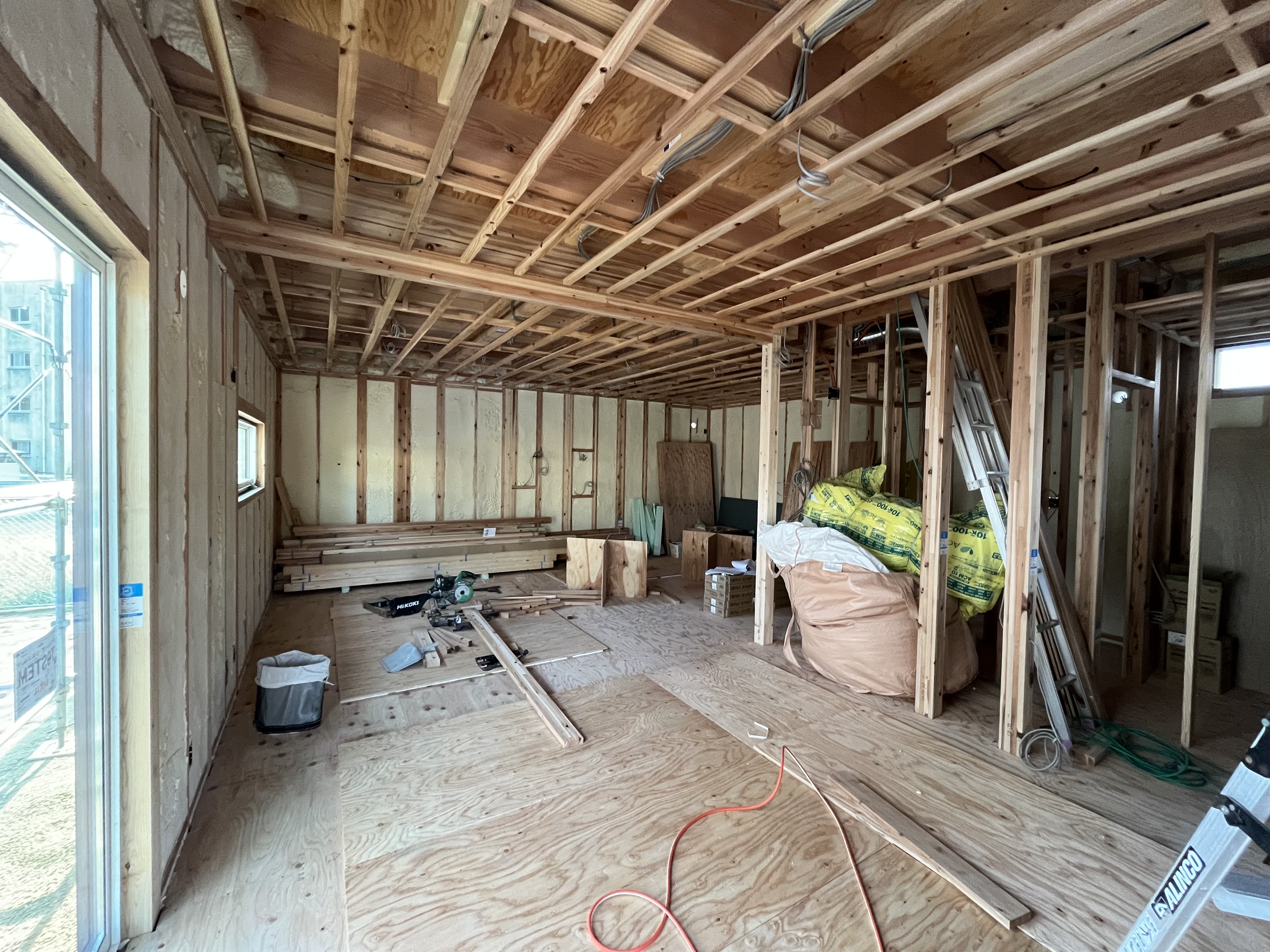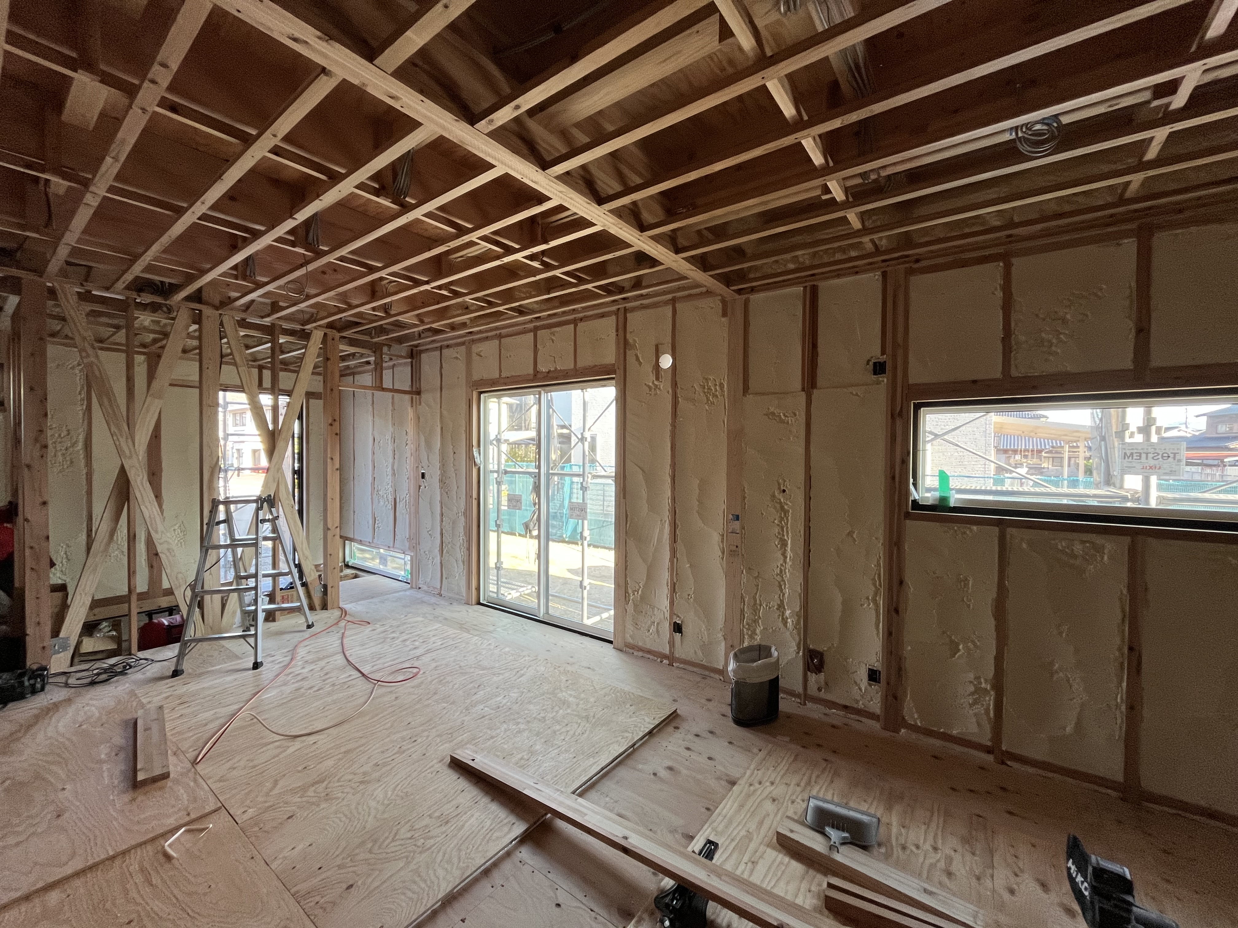 周南市N様邸の吹付断熱工事が完了しました。 窓も付いたので一気に外部の音が静かになりました。 断熱材は熱だけでなく音にも効果があるのを実感します。 肝心の熱に関しては、今から天井の断熱を施工するとぐるりの断熱が完成するので、気密性が上がりこれまた断熱性を実感することが出来ます。 お家ができていく様を見るのはとても楽しいです。