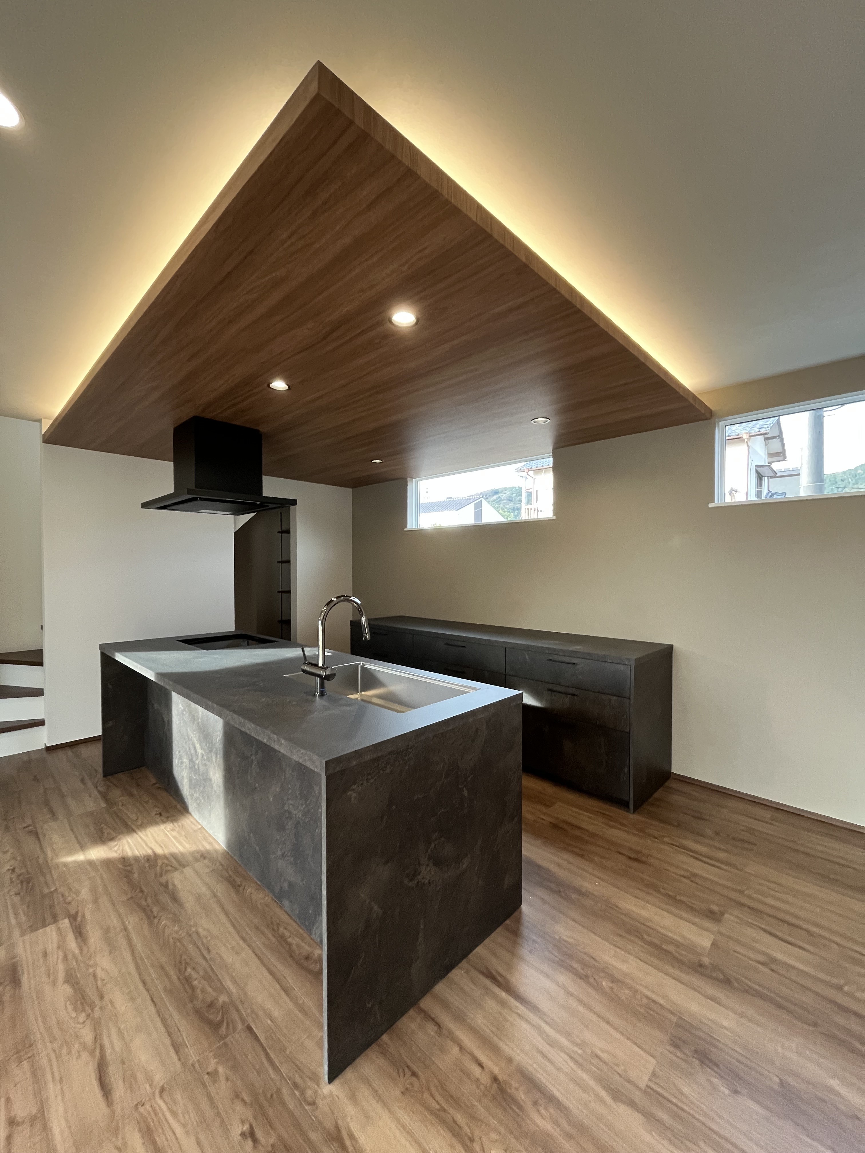 キッチンの天井も壁紙木目、間接照明を採用されており、LDK全体が素敵な空間になっております。