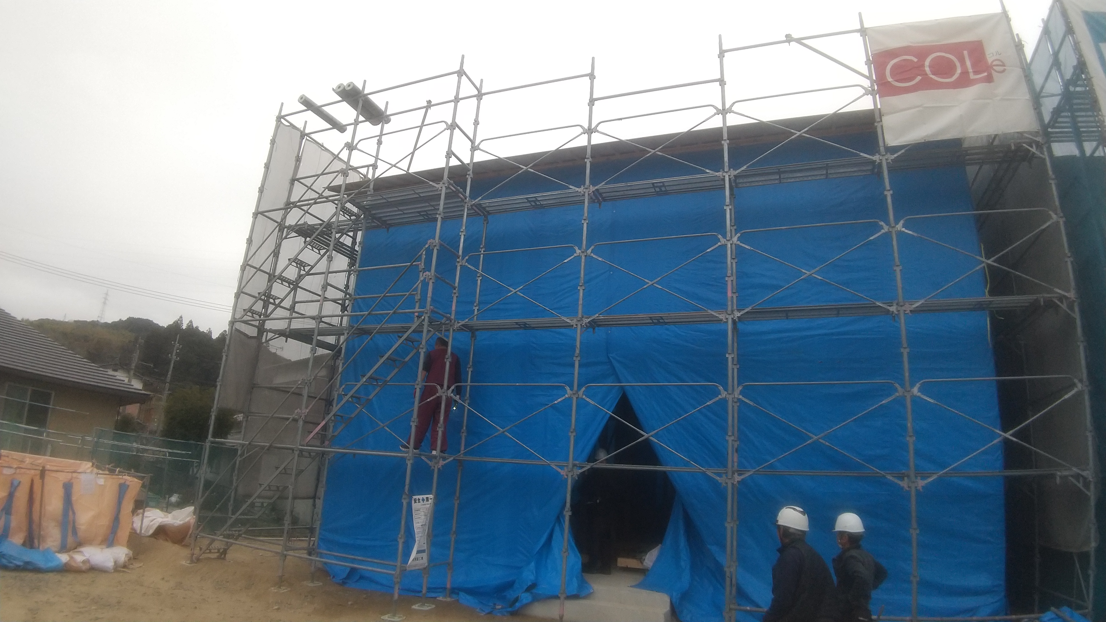 雨が降り出す前に屋根のルーフィング貼りや 外部のブルーシート養生も出来たので良かったです。 後日、屋根のコロニアル貼りや 壁の面材貼りに進みます。