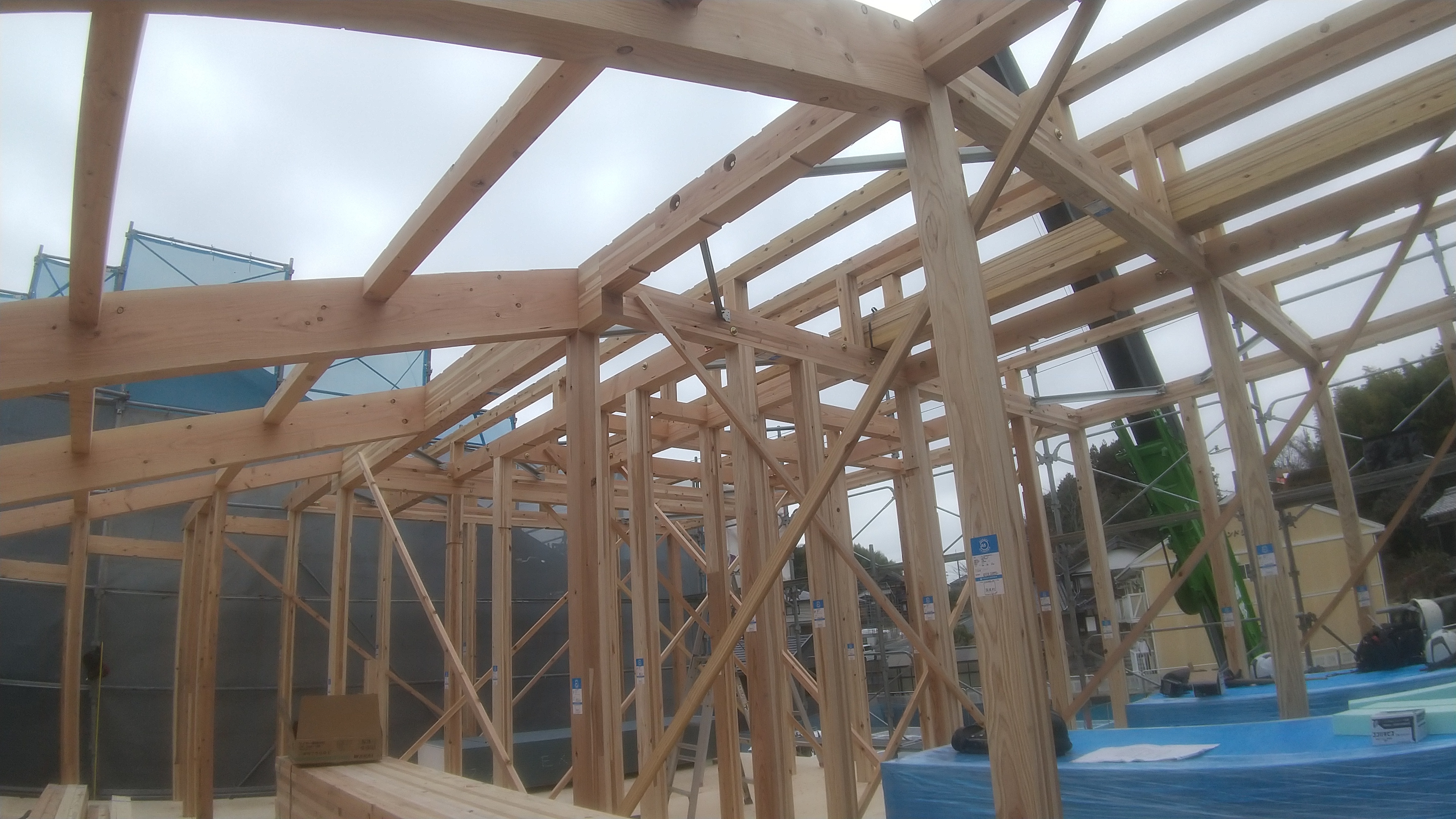 屋根地組が終わり 棟母屋が組み上がり 上棟となりました。 写真で見る通り手前側は 吹抜勾配天井になるので登り梁が入っています。