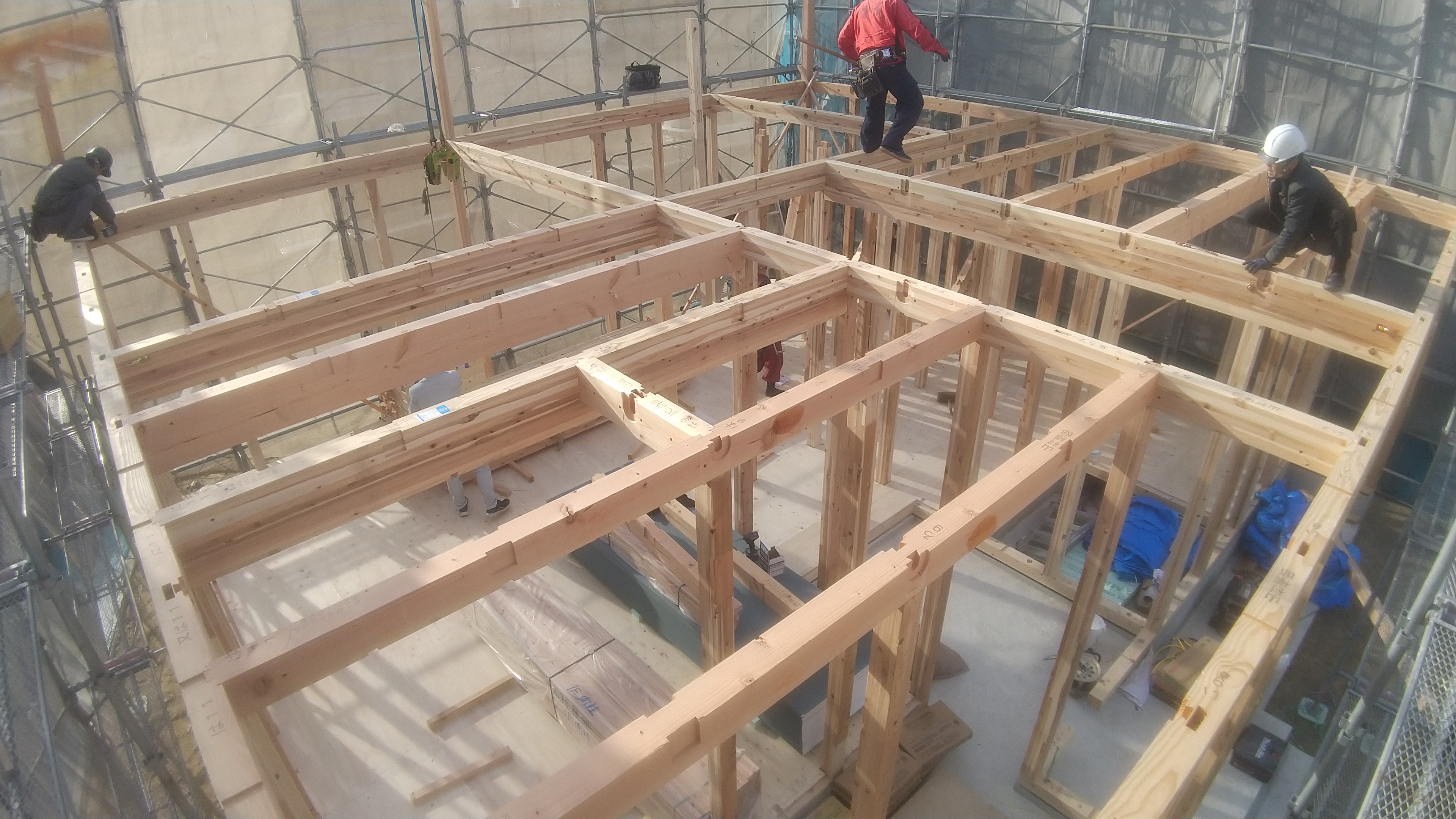 1階の桁、梁の組立作業です。 昔は大工さんの手作業による 木材の加工技術に左右される事が有りましたが 今はコンピューター、機械による加工なので ピッタリ組付けができて どの家も高品質の軸組となっています。