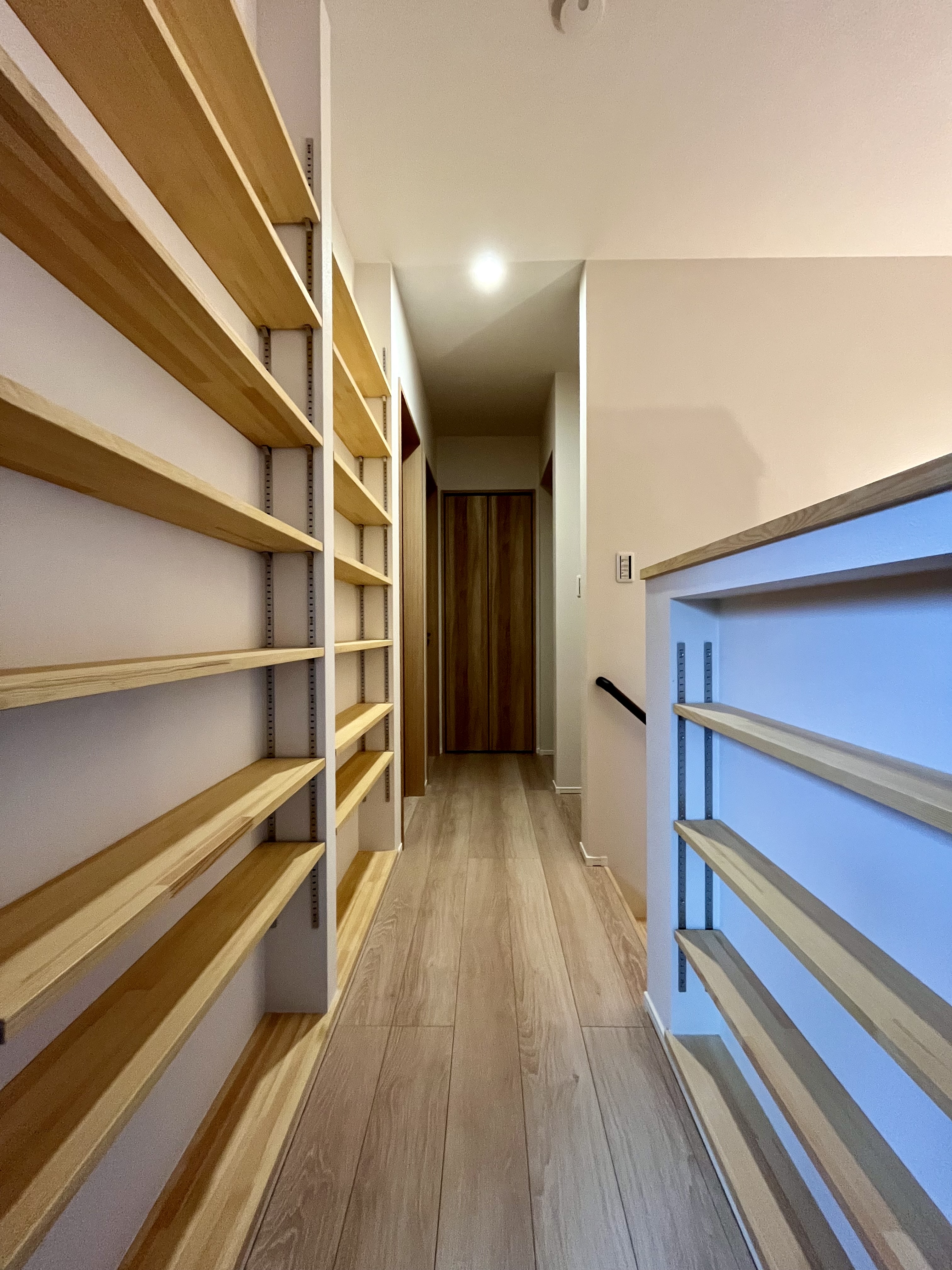 本日お引き渡しのO様邸 本がお好きなO様邸には本棚を沢山作っています。 廊下の全面を本棚として有効利用しています。