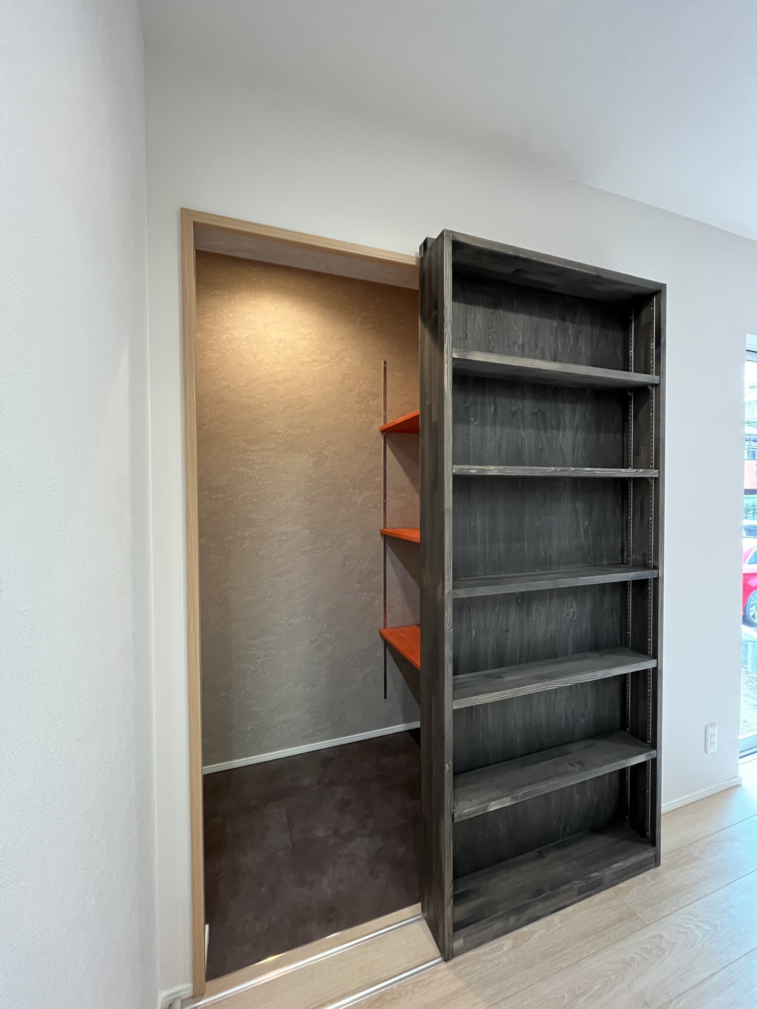 さらにLDKにも本棚があるのですが、そこに仕掛けがありまして 可動式になっており、スライドさせるとなんと隠し部屋があらわれます。 そんな遊び心溢れる素敵なお家になっています。 O様本日はおめでとうございます。 今後とも末永いお付き合いをよろしくお願いいたします。