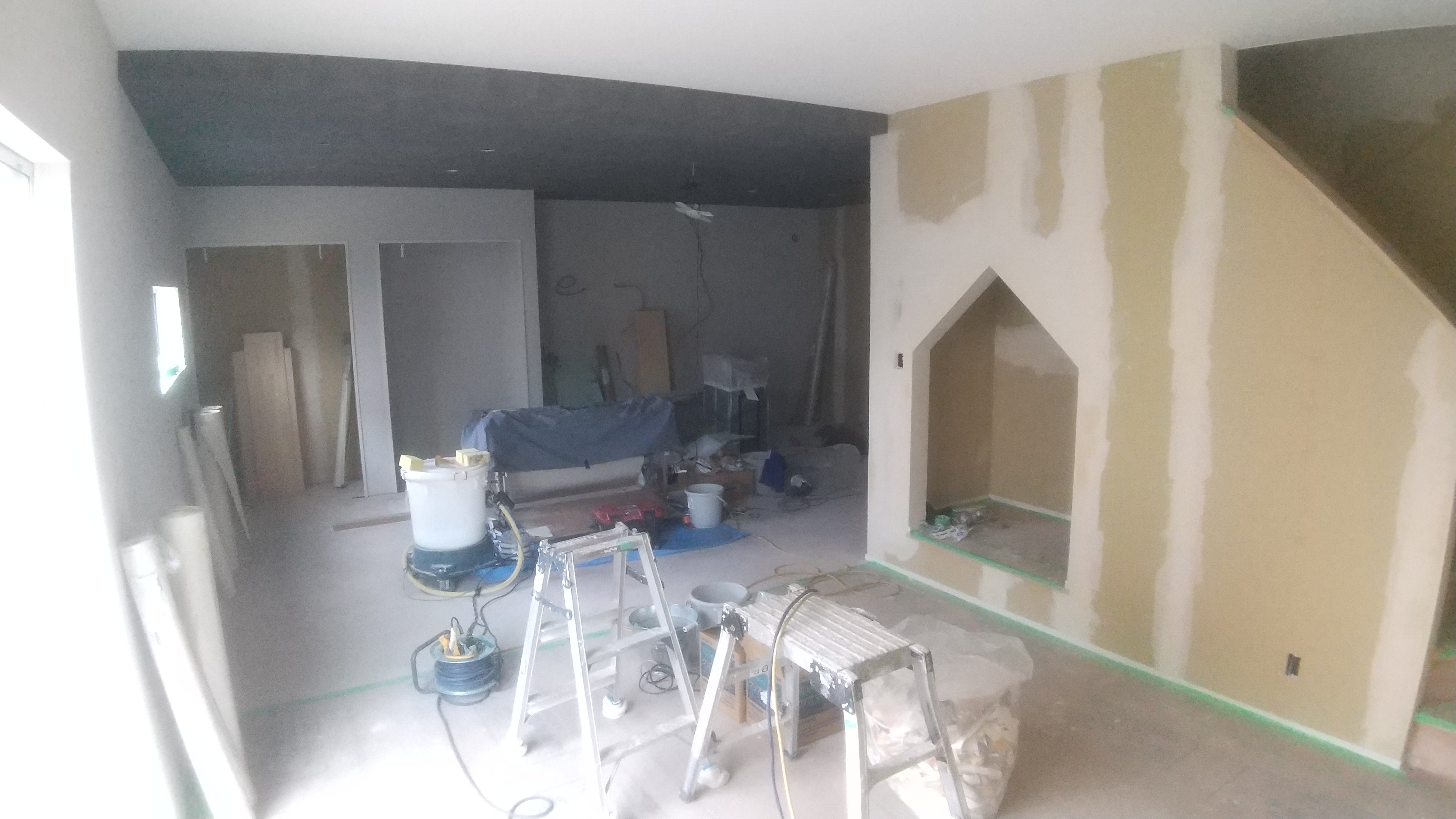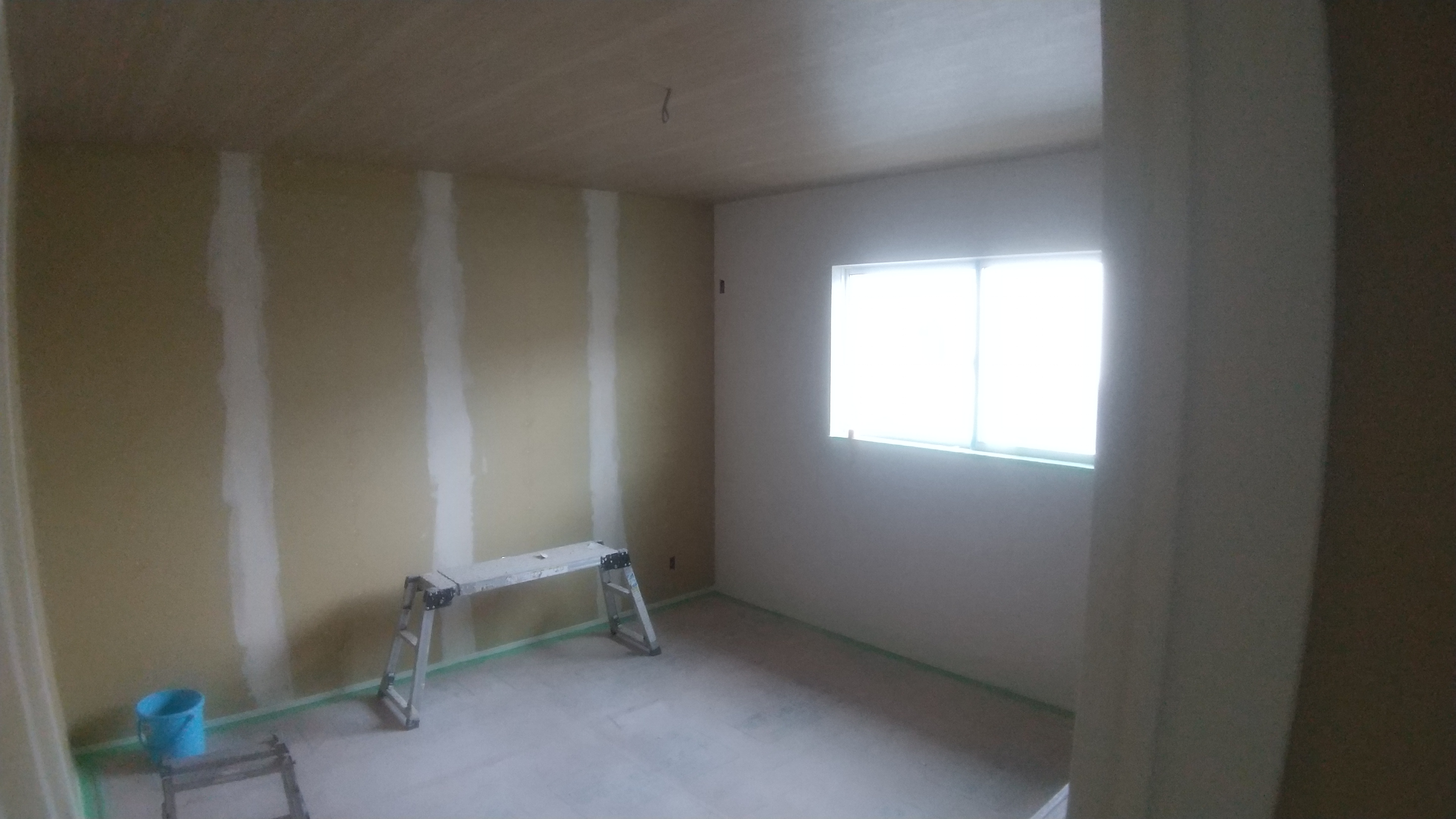 2階部屋の写真です。 天井と壁のクロスを貼り進めています。