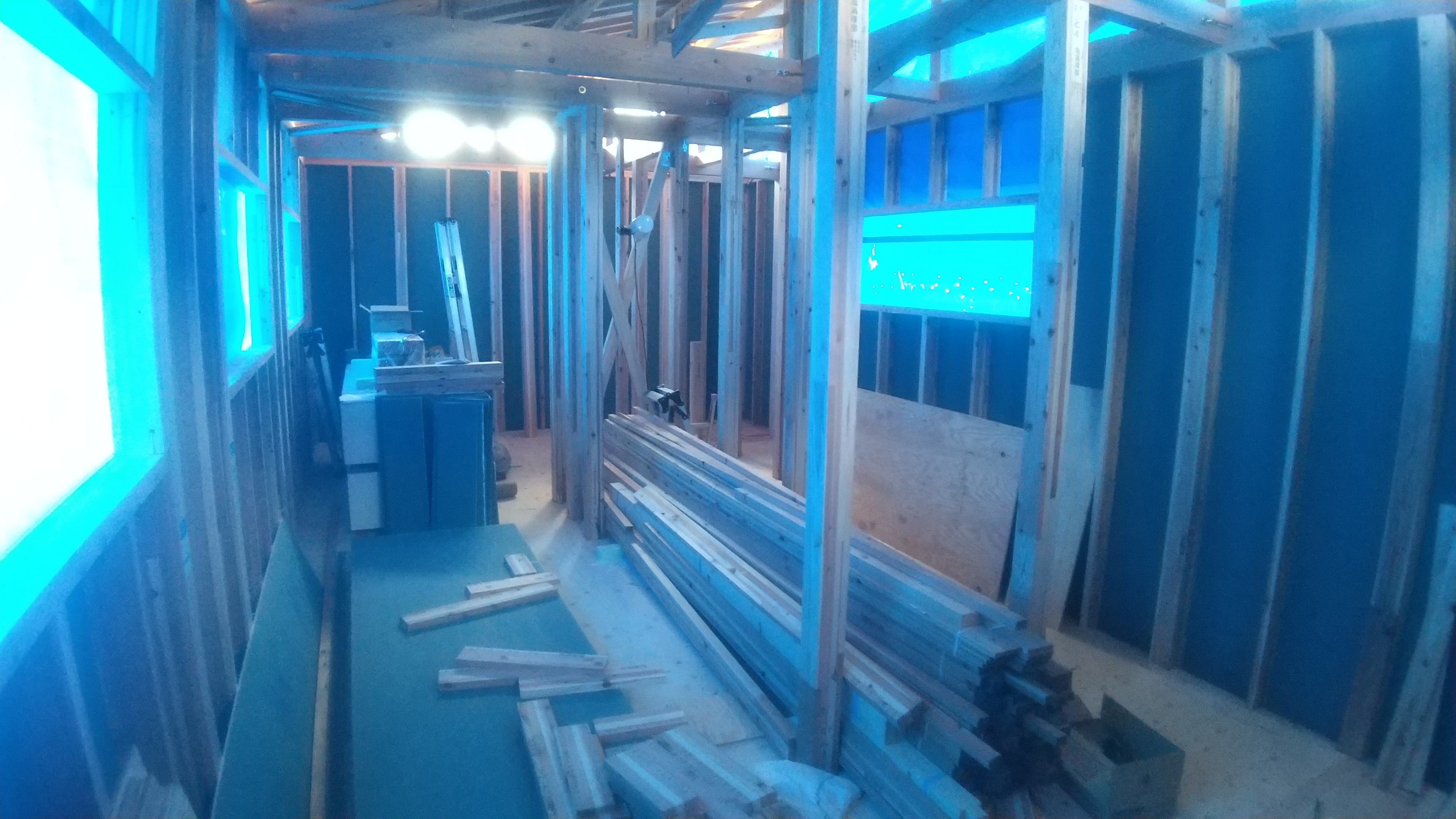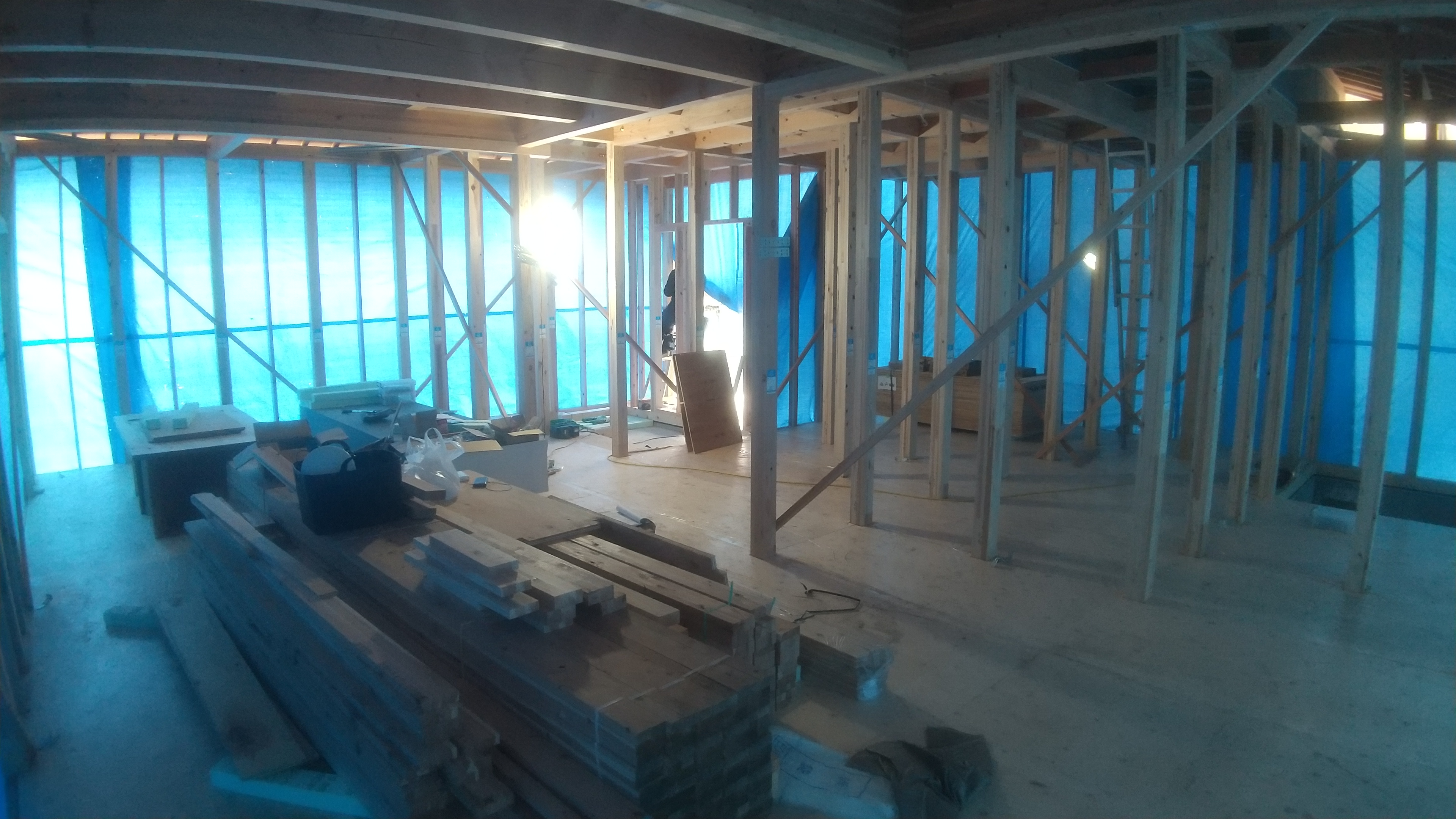 外面に雨養生のブルーシートを貼り 内部の作業を進めます。 1階の写真 木材の締結金物を止めたり、 間柱や開口部のマグサ材を入れています。 雨が止んだら、外面の面材ボードを貼り進めます。